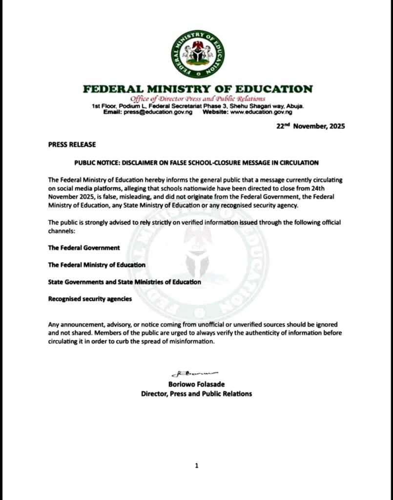 A fake school closure notice in Nigeria began circulating across WhatsApp, Facebook, TikTok, and Telegram on 22–23 November 2025. The viral message falsely claimed that all schools nationwide had been ordered to shut down from 24th November 2025 due to alleged “security concerns.”